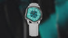 The Aqua Dimension edition captures the serenity and vitality of water in motion. Its turquoise metallic dial changes tone with the light, giving a sense of continuous flow. Encased in polished steel with a sculptural silhouette, this 8 mm-thin quartz masterpiece is chip-controlled for micro-second precision. Completed with a clean white strap, it’s a wearable statement of clarity and calm.